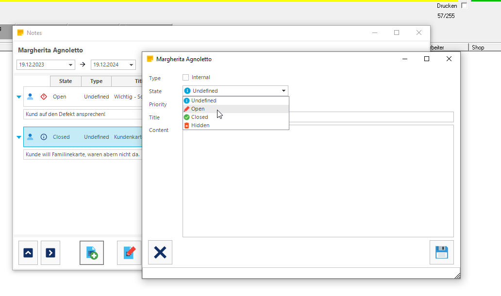 Eine neue, umfangreiche Notizfunktion steht optional zur Verfügung. Sie ermöglicht eine historische Kundennotiz und ist mit unterschiedlichen Notiztypen und Prioritäten ausgestattet. Wenn Ihr Interesse an dieser Funktion habt, können Ihr Euch mit einer Email an office@sportsrental.de unter Angabe Eurer Lizenzinformationen anmelden.